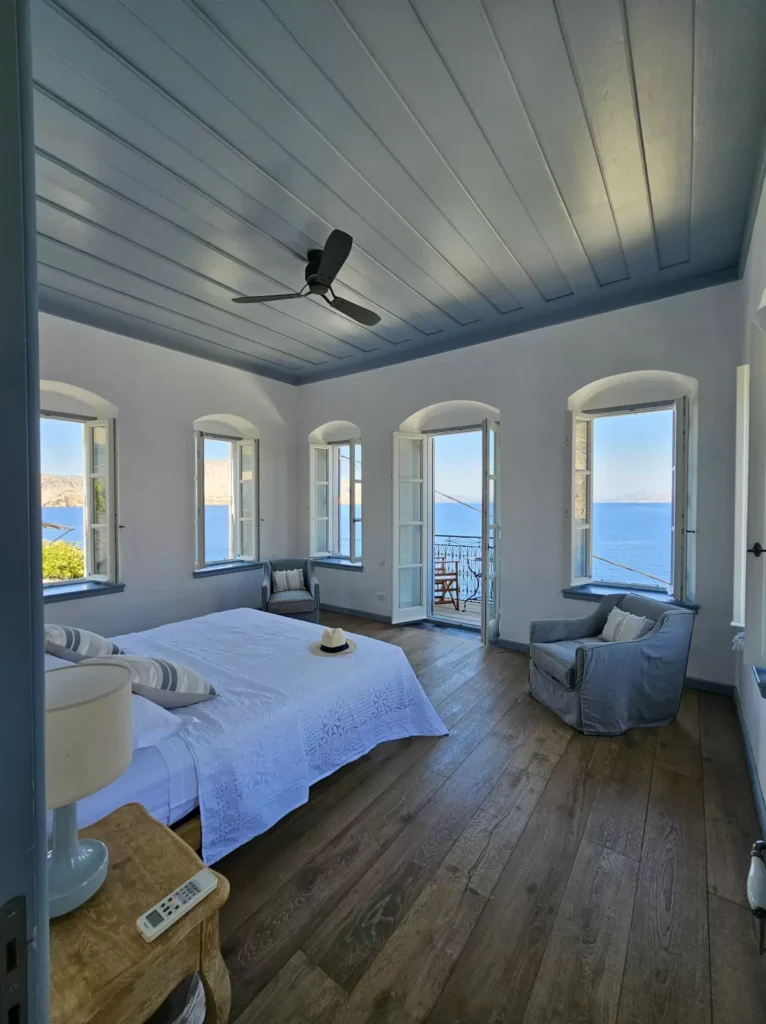 The rooms at The Anchor House are deliberately simple, letting the truly wow breathtaking view take centre stage. Floor-to-ceiling windows frame the harbour, fishing boats, and neoclassical houses tumbling down to the water, with the hills rising behind them. Interiors are airy and understated, with soft linens, hand-finished details, and thoughtful touches that feel considered rather than staged. Morning light spills across the floor, making it impossible not to linger over a cuppa of English Brekkie on the balcony. We slipped into the refreshing sea for sunrise swims, returning to rooms still warm with the day’s first sun. Evenings are equally compelling: the day-trippers have gone, the harbour is still, and lights from the houses reflect in the water.